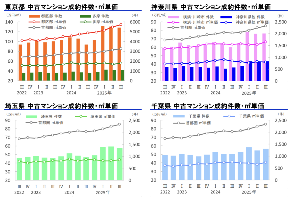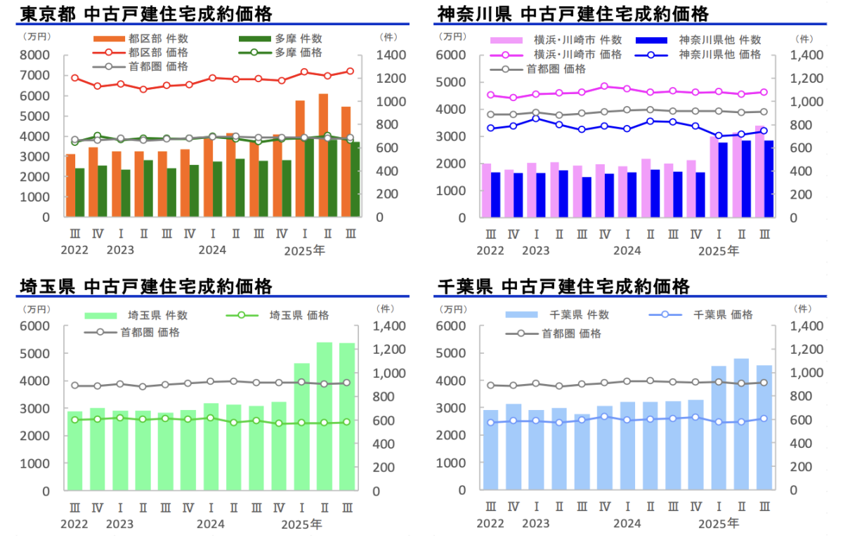 下図は中古戸建ての価格等の推移を示していますが、戸建てについては都区部も大きく価格が上昇していません。高市政権のもとで価格上昇が見込まれるのも、やはり都心部かつ利便性・流通性・資産性が総じて高いマンションが中心です。