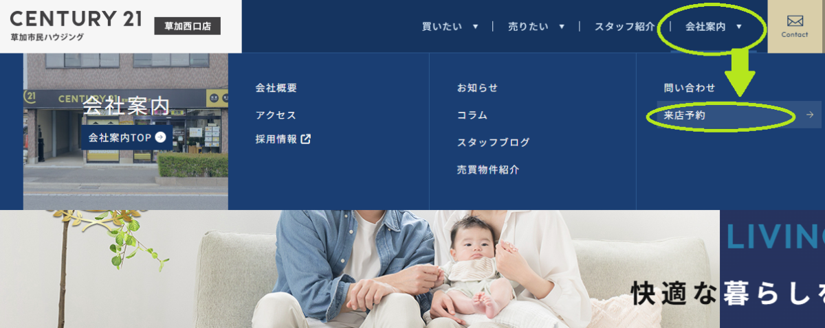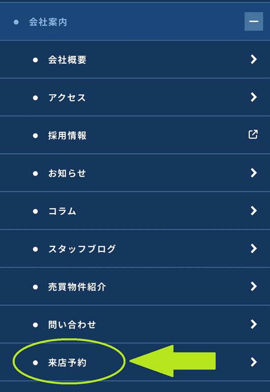 会社案内のメニューが下に出てきますので、「来店予約」を選択してください。
