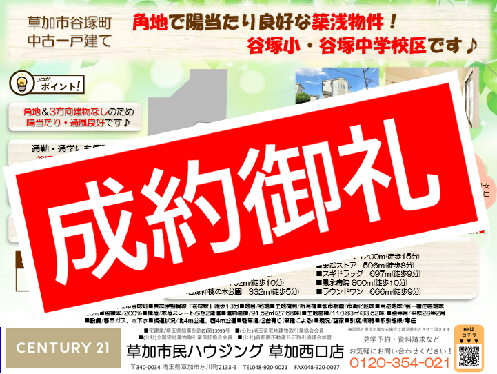 ご売却のご依頼でお預かりしておりました、草加市谷塚町 中古一戸建てがご成約となりました。多くのお問い合わせをいただき、ありがとうございました!